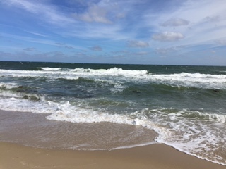 The next day after breakfast at the hotel we took walks along the beach. It had cooled off and clouded up a bit, and it was windy. The grasses swayed and the surf raged.