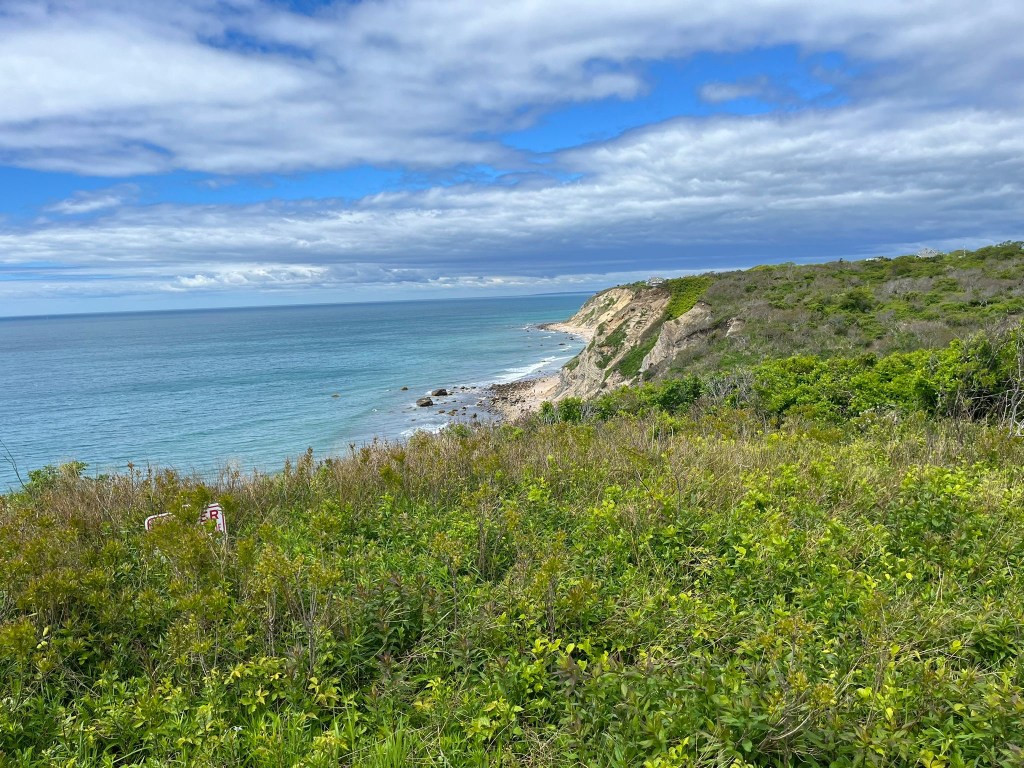 Pale peach colored clay bluffs soar 200 feet above sea level at Mohegan Bluffs.
