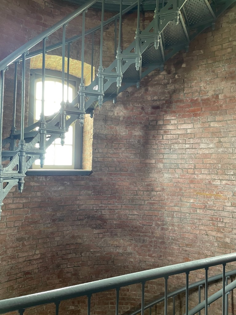 Once on our lighthouse tour, our guide Gus seemed to know everything there is to know about lighthouses and admitted he could talk on endlessly if we didn’t stop him! We learned that the lighthouse had been built in 1873 and was maintained by three lighthouse keepers who lived on site with their families in the neighboring house. While housing was free for the families, the lighthouse keeping life was hard labor. There were barrels of oil that were kept in the base that had to be carried up the steps to feed the glowing oil lantern several times a day. The iron steps that wound up to the top were original, and back then had to be painted over almost each day to prevent it from rusting from the salty ocean air.