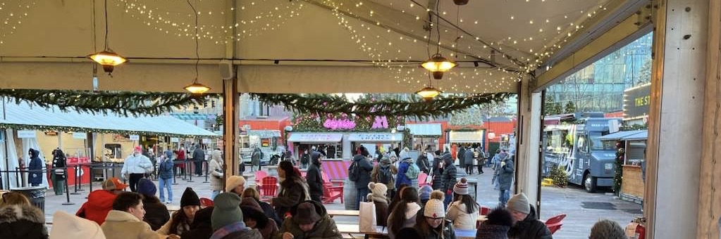 The Christmas market at Seaport is called “Snowport” and was a lot of fun to visit. We went there during a Monday afternoon, so we didn’t encounter large crowds. It was a fairly easy 20 minute walk from our hotel, just across the bridge on Seaport Avenue and into the Seaport district, which also has some shopping. Since it was super cold that day, we hustled into the market and made a beeline to the Baked Cheese Hause for some yummy cheese raclette sandwiches, which we washed down with some outstanding Gluehwein in the outdoor drinking tent under some heat lamps.