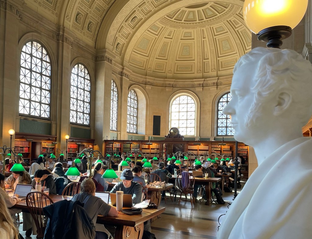 Bates Hall which is the reading room known for its grand barrel-vaulted ceiling, green lamps and scholarly atmosphere,