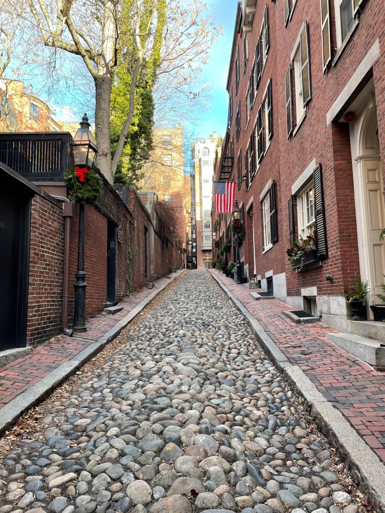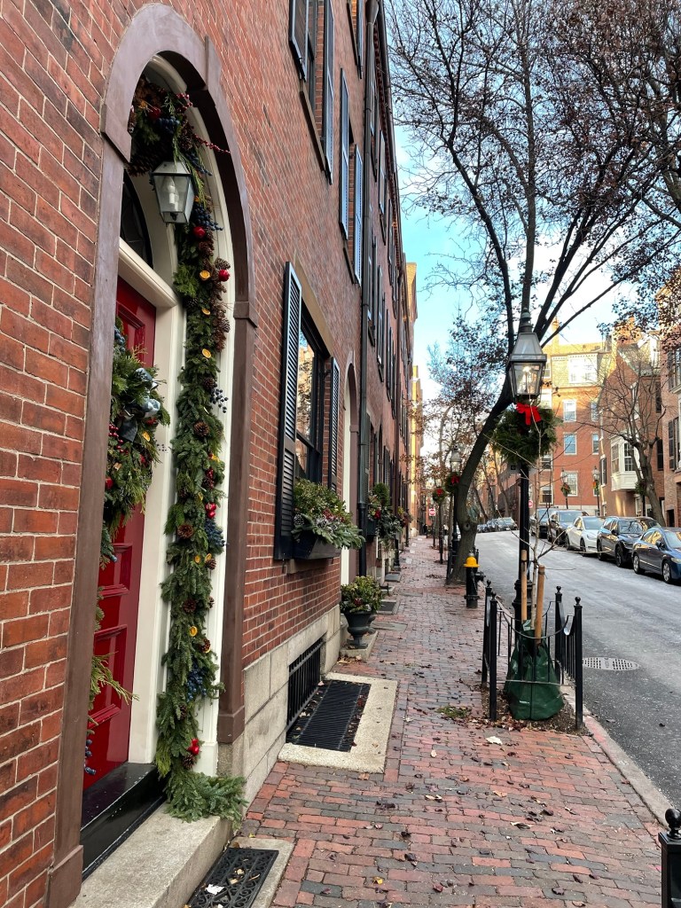Beacon Hill is one of Boston’s most picturesque neighborhoods, especially during the holiday season. Streetlights illuminate the historic brownstones adorned with festive wreaths and garlands, creating a charming holiday atmosphere.