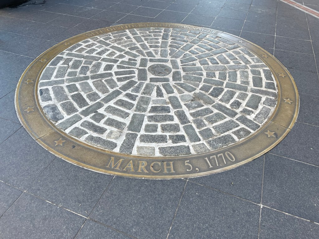 Located in front of the building is a plaque that marks the location of the Boston Massacre, which is said to have sparked the American Revolution.